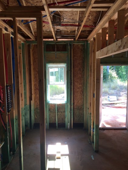 I’m standing in the laundry room and looking into Sue’s office. The wing wall separates the laundry from the office while still allowing some natural light into the laundry. Pocket door opening on the right into the keeping room, and the doorway to the screened in back porch.