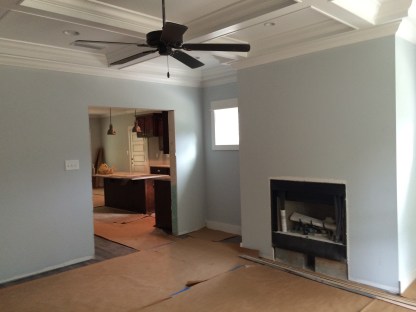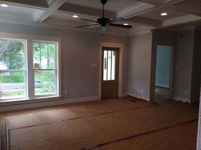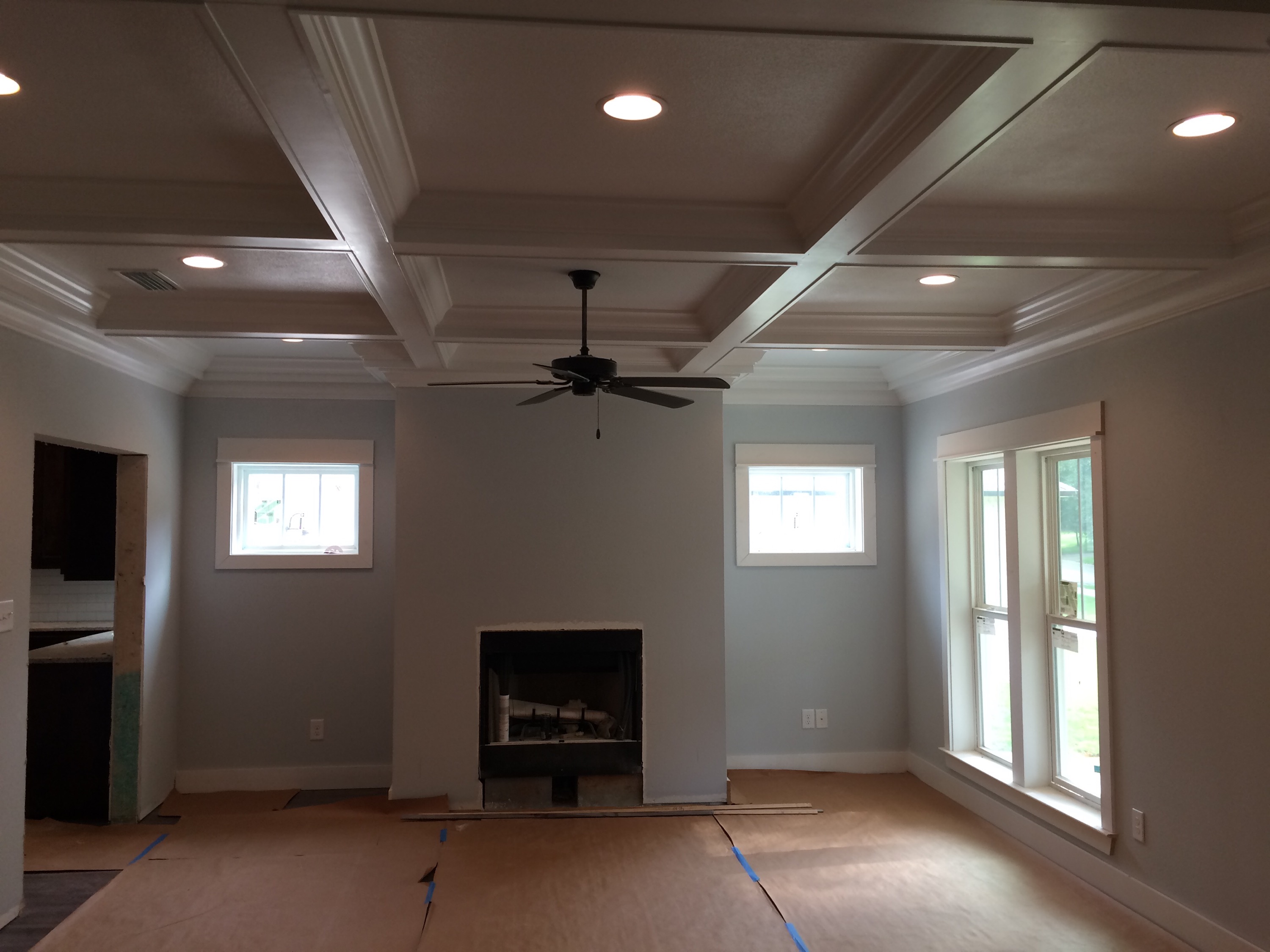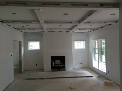 Living room with coffered ceiling looking north. When the bricklayers come back to do the steps they will build the raised hearth and brick around the wood-burning firebox.
