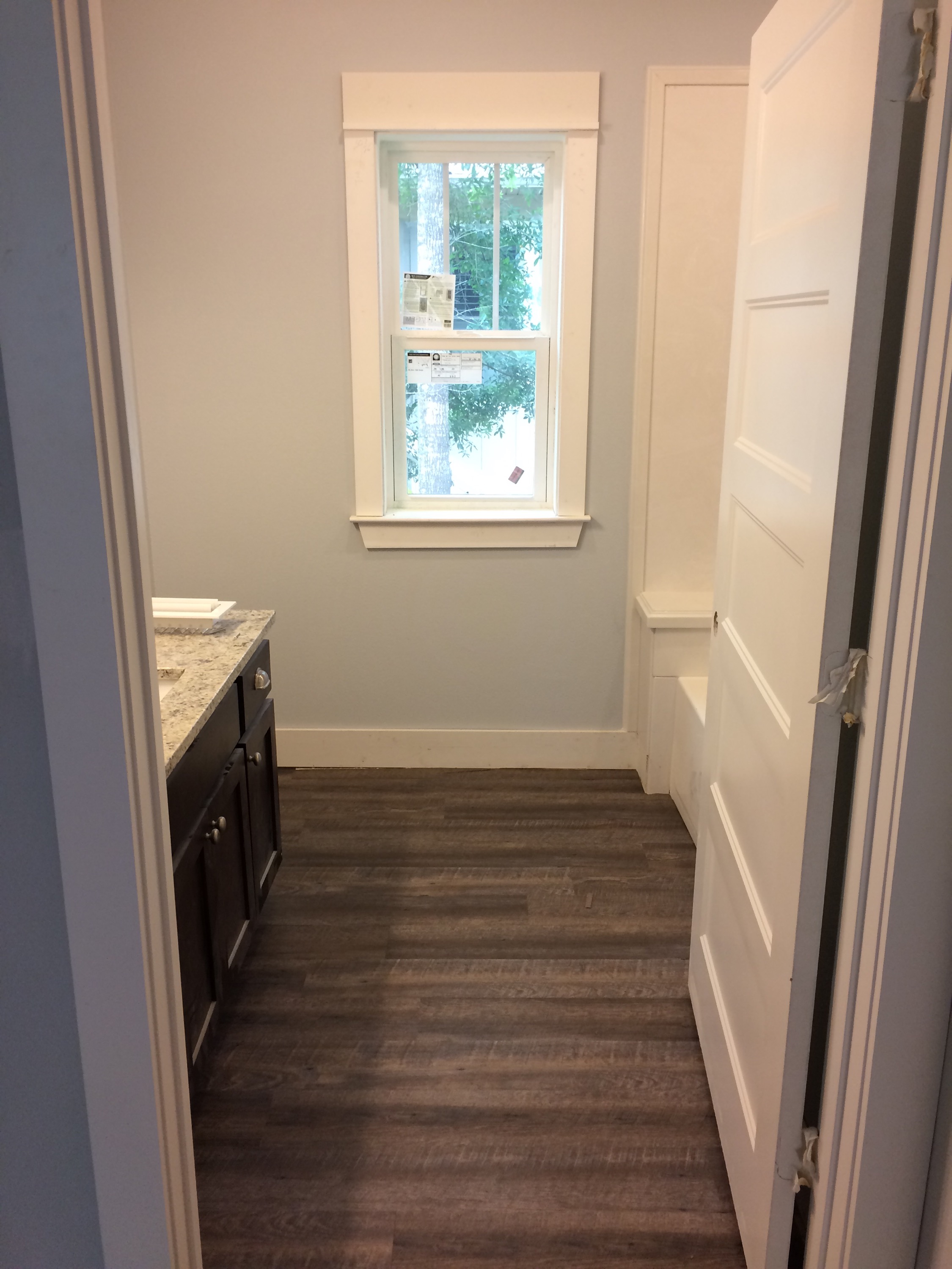 The luxury vinyl tile is sawtooth gray. The walls are Misty (also Sherwin Williams).