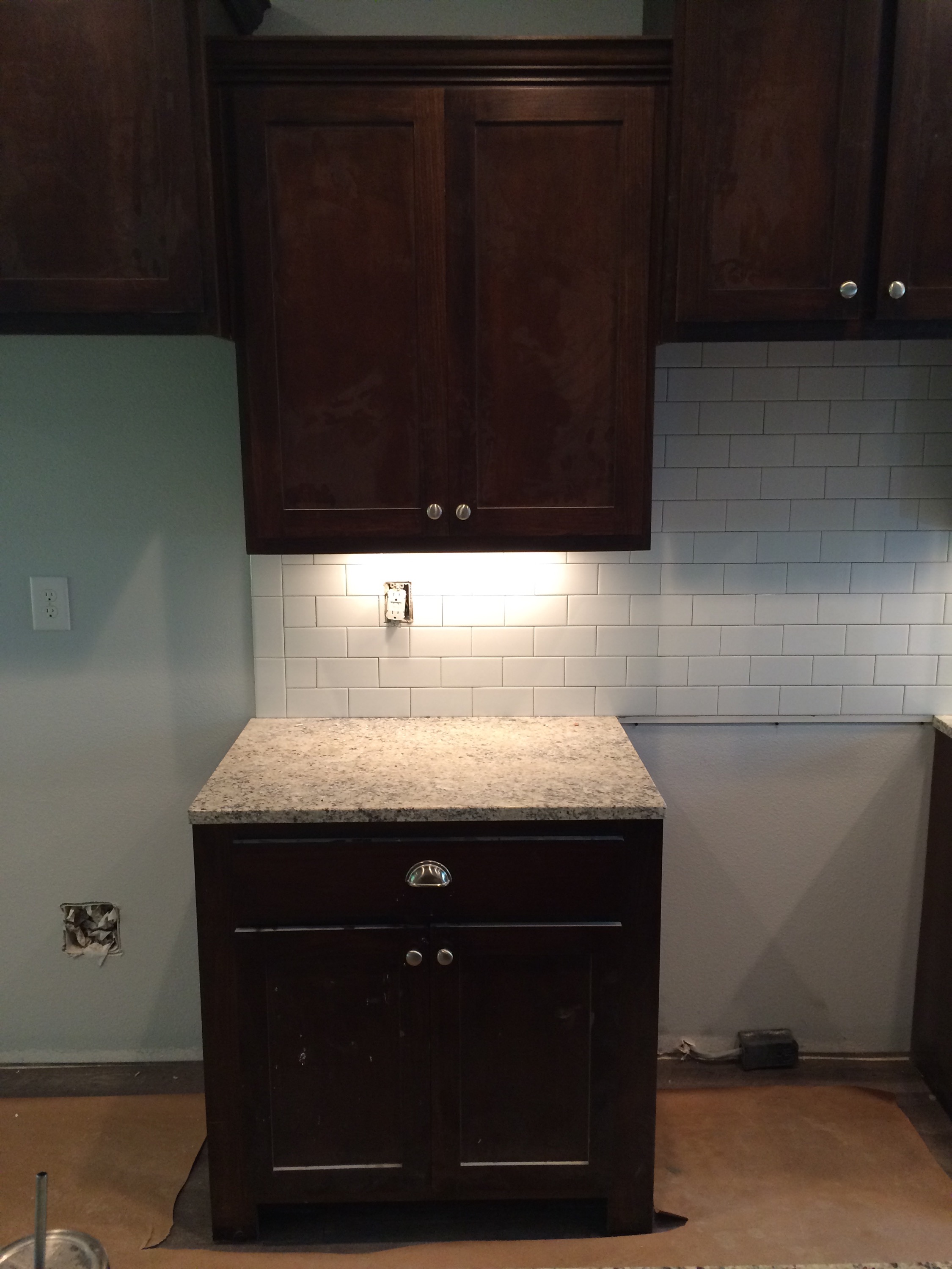 The giallo fiesta granite and subway tile back splash provide a nice contrast to the coffee stained cabinets.